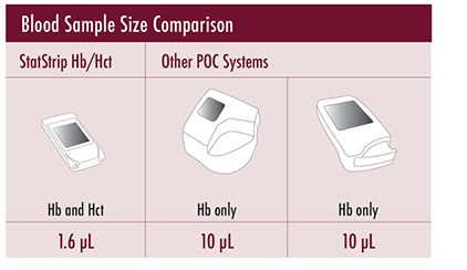 Da das StatStrip Hb/Hct nur eine durch Fingerstich gewonnene 1,6-µl-Kapillarblutprobe erfordert, sind routinemäßige Hb- und Hct-Tests und Anämiescreenings für den Patienten praktisch schmerzfrei.